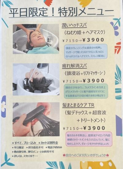 ヘアやヘッドスパのお得なメニューもございますので、